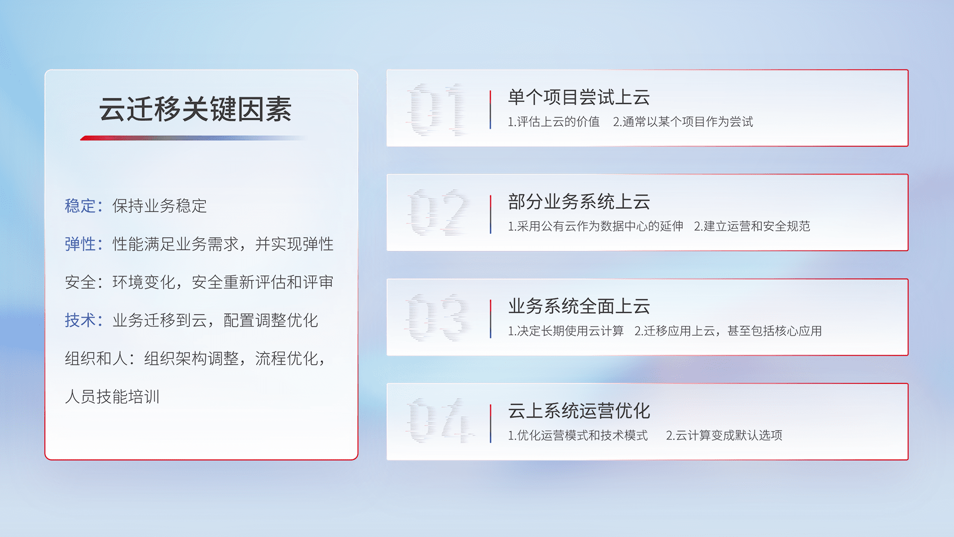 结合实际业务,,,从规划设计、、、云平台选型、、云原生改造、、、数据迁移、、集成交付,,,,迁移全过程为客户识别最佳上云路径,,,做好风险识别管理,,,,设计网络架构、、身份权限、、安全审计合规、、、、操作审计、、、日志审计、、、、监控告警策略、、、、多站点容灾设计等,,,对云上基础设施进行整体规划,,,,提升IT治理水平,,以满足弹性、、、高可用、、高性能的需求。。。。