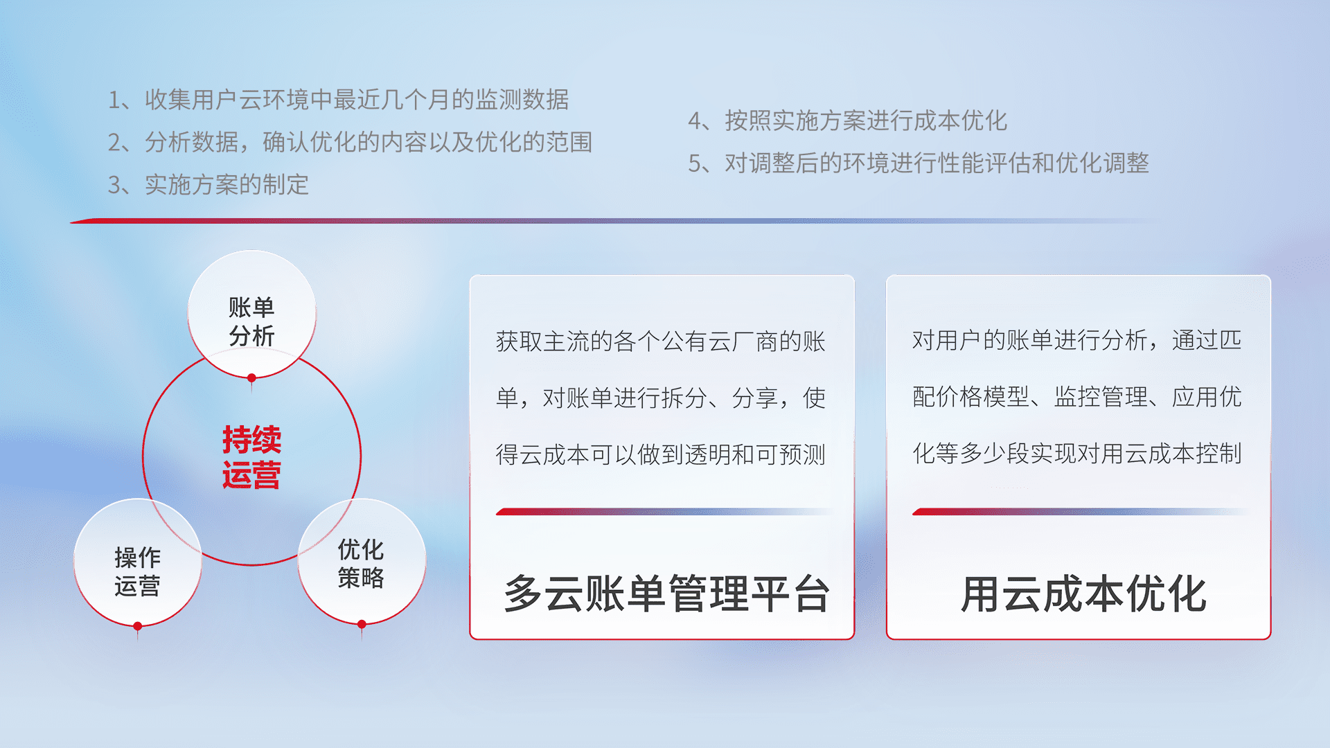 通过多云纳管,,,以统一的资源数据模型把客户的云资源进行抽象和封装,,,进而实现对多云资源的统一操作,,保障云资源管理的可靠性、、稳定性与可用性。。量身定制化运维内容,,,,配置、、开发运维、、、补丁管理、、备份、、监控、、认证和访问管理、、、、审计和日常巡检等,,保障在用云过程中的可靠度,,,,稳定度以及高可用率。。